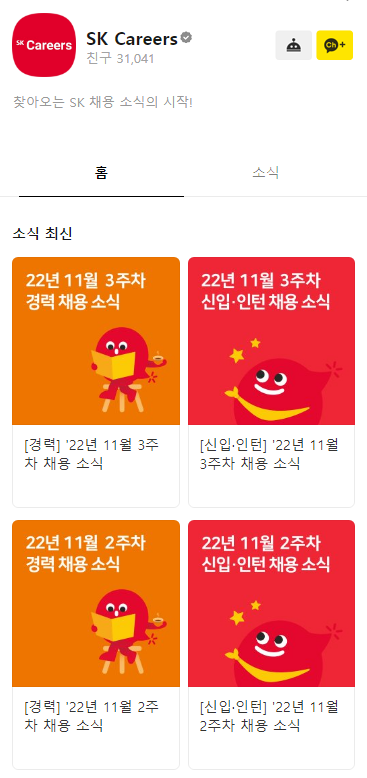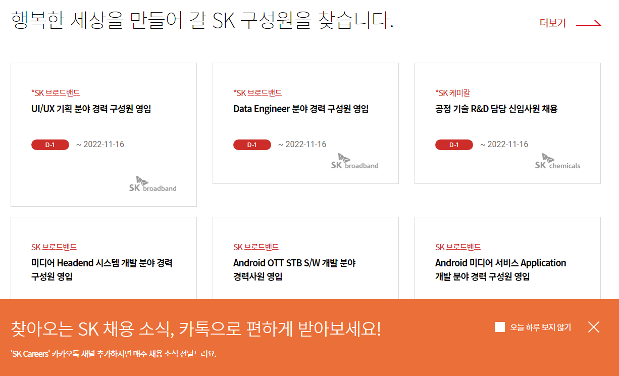 SK는 커리어 페이지 하단에, 카카오톡 플러스 친구 URL을 링크해두었습니다.