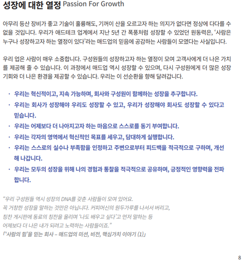 “성장에 대한 열정”, “변화와 혁신”을 전하고 있습니다.