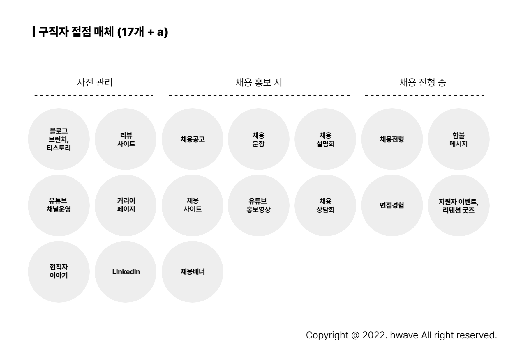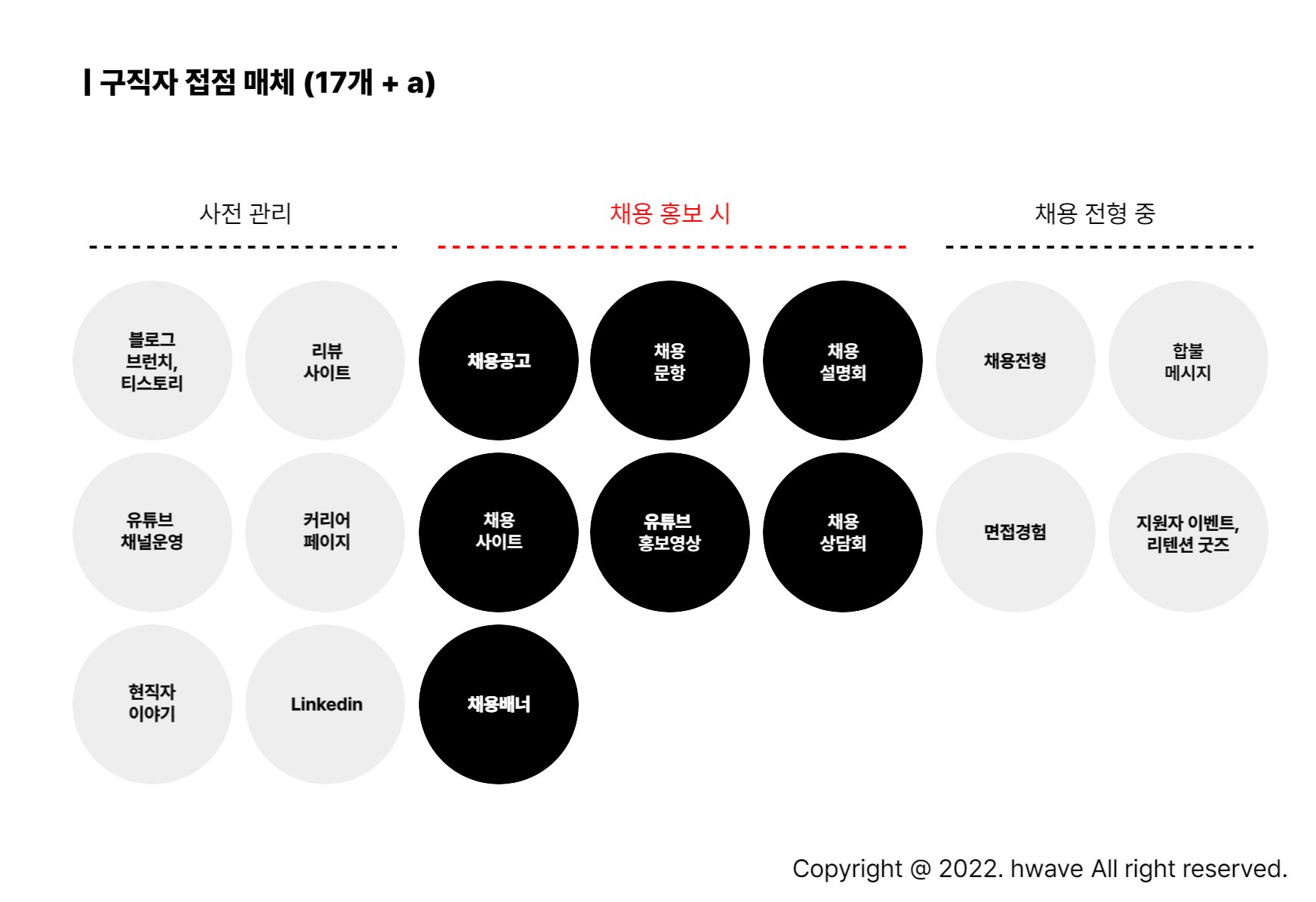 Hwave에서는 아래와 같이 채용 전형 단계별로 구직자 접점 채널을 나눴는데요.