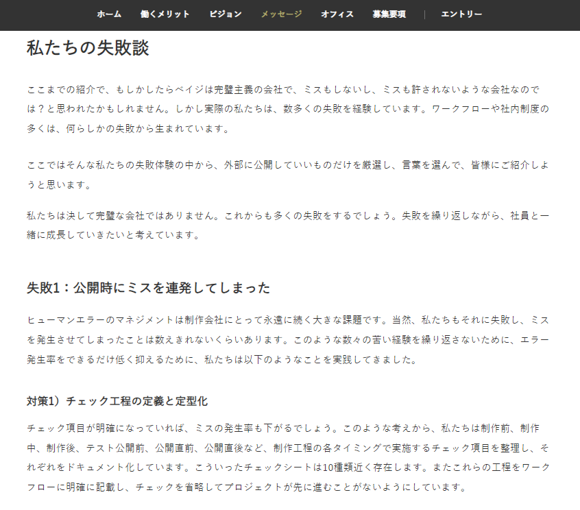 b2b 웹제작사 기업 베이지는 <우리의 실패담>이라는 콘텐츠를 채용페이지에 업로드합니다.
