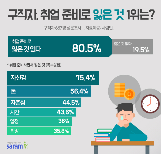 2018년 사람인에서 구직자 687명을 대상으로 ‘취업 준비로 인해 잃은 것’에 대해 조사한 결과,