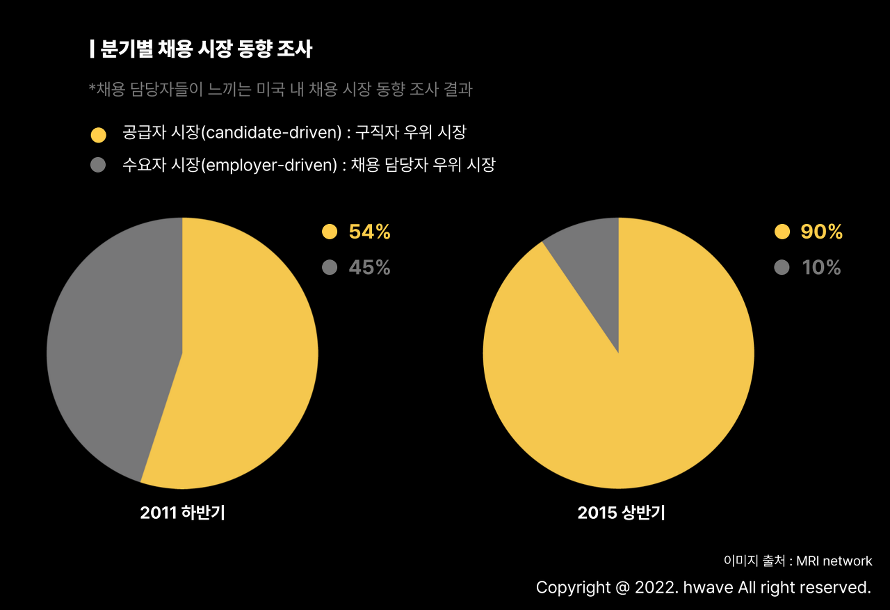 2015년 상반기 이후에는 90대 10으로 공급자, 즉 구직자에게 유리한 상황으로 봤다고 합니다.