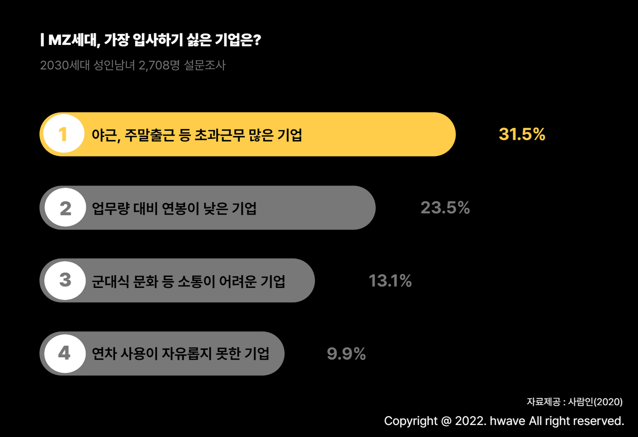△야근, 주말 출근 등 초과근무 많은 기업(31.5%)이 1위에 올랐다. 이는 ‘워라밸’과 개인의 삶,