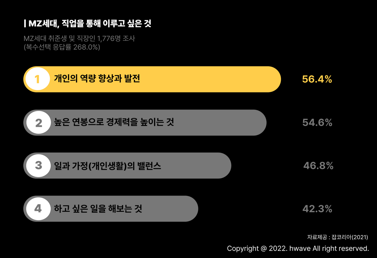 - 출처 : 워크투데이, <MZ세대가 직업 통해 이루고 싶은 것은...... ‘개인 역량 향상’, '높은 경제력'>